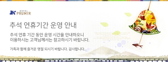 | 제목 | 2019. 추석연휴 호텔푸르미르 운영시간 안내 | 등록일 | 2019-09-09 |